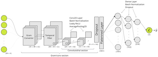 As in [10], we defined as a three-dimensional tensor of shape , where w denotes the window length and R denotes the count of selected feature pairs. This tensor is populated with the transformed feature pairs , each dimensionally aligned to facilitate the CNN’s learning process.