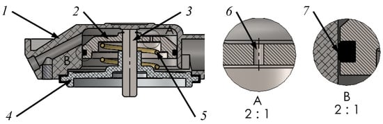 Schematic of differential section of pneumatic braking valve, based on construction of relay valve Visteon 44100110 [31]: 1—body; 2—piston; 3—guide; 4—cap; 5—spring; 6—nozzle; 7—sealing.