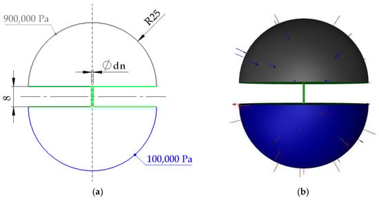 Model view: (a) dimensions and initial inlet and outlet boundaries, dn = 0.75 mm, nozzle diameter (0.75…5.00) mm; (b) model prepared in Ansys Fluent with defined inlet and outlet pressure boundaries.