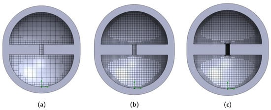 Numerical calculations of the issue analyzed in this study were carried out using two numerical environments, SolidWorks Flow Simulation (SW-FS) and Ansys Fluent (A-F). In engineering practice, SolidWorks Flow Simulation is only used for the initial estimation of flow parameter values due to the limited shape of the mesh cells. An orthogonal (hexahedral) mesh consists of cubic cells, perpendicular to the main coordinate system, with a defined degree of density. Wider possibilities in this area are offered by the Ansys Fluent software [34,35], which allows for the advanced definition of the shape and density of the finite volume mesh. The correct choice of numerical mesh plays a key role in the quality of the results obtained. During numerical calculations using CFDs, global meshes with a declared maximum edge length and shape are used in cross-sections with large flow volumes and local mesh densities in key areas [36], for example narrow channels. Local computational mesh densities allow us to minimize model discretization errors. The parameters of the finite element mesh should be chosen by taking into account the optimization conditions related to the evaluation of the geometrical criteria of the mesh, such as, for example, aspect ratio and skewness [37], as well as simulation time and the number of iterations. By dividing the flow area into a set of discrete cells, it is possible to determine by numerical methods, the parameters of the stream flow, according to the assumed boundary conditions, by solving a system of differential equations resulting from the principle of the conservation of the momentum of the flowing fluid and the Navier–Stokes equations [38].