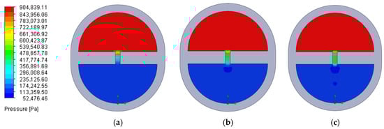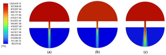 Pressure distribution for different meshes, SW-FS (3.00 mm nozzle): (a) global mesh in 4th size, (b) global mesh in 7th size, and (c) global mesh in 7th with local advanced refinement.