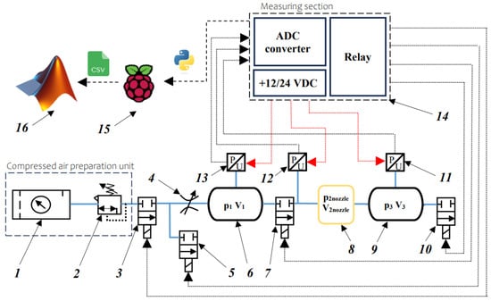 Structural diagram of the test stand: 1—compressor; 2—pressure regulator; 3, 5, 7, 10—solenoid valve; 4—choke valve; 6, 9—40.23 × 10−3 m3 tank; 8—tested nozzle; 11–13—pressure transducer; 14—measuring section; 15—Raspberry Pi; 16—MATLAB software, R2024b.