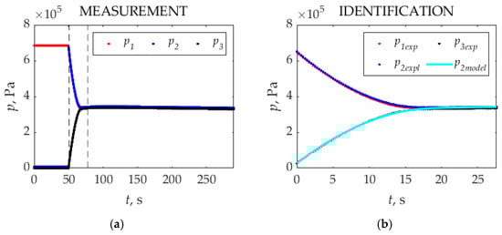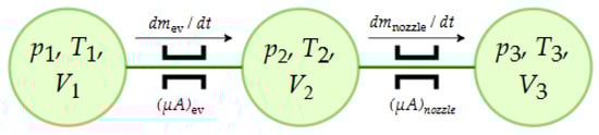The identification of the nozzle flow parameters was carried out in the MATLAB environment, where a mathematical description of the process built from the structural diagram of the bench (Figure 7), based on the lumped method [62], was implemented. All this allowed for the search for the throughput from the runs recorded on the test bench.