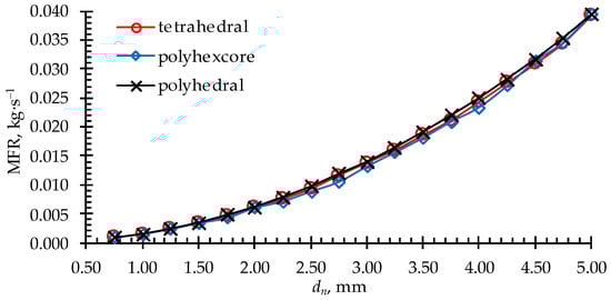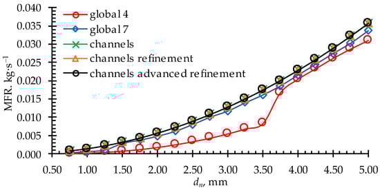 In the course of the simulations carried out using the SolidWorks Flow Simulation environment, due to the limitations of creating the finite volume meshes of the 3D model and assessing their quality using indices, the mass flow rate (MFR) value of all the adopted nozzles was determined using four variants of the hexahedral mesh: