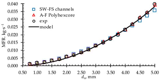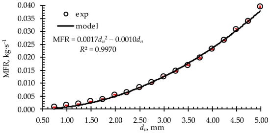 - The experimentally determined regression equation, MFR = 0.0017 dn2 − 0.0010 dn, provides the basis for estimating the remaining values of the mass flow rate in front of a nozzle of the assumed length for other bore diameters in the range of (0.75…5.00) mm.