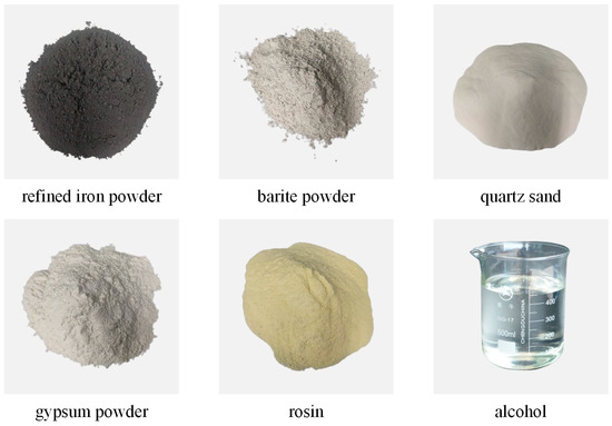 Simulation materials similar to rocks are generally composed of coarse aggregates, fine aggregates, and binders, and they always possess characteristics such as high density and low strength. However, materials prepared using the slurry casting method [18,20,27] often have issues such as low density, high strength, unstable mechanical properties, and long production times. Zhang et al. [28] developed a novel rock-similar material (IBSCM) that exhibits characteristics such as high density, low strength, stable performance, and short drying time. Building on previous research, this study selected refined iron powder and barite powder as fine aggregates, quartz sand as a coarse aggregate, and rosin–alcohol solution as the binder to formulate similar materials. Gypsum powder was added to adjust the brittleness of analogous materials. The material components are shown in Figure 1. In the figure, the barite powder is a mixture of equal proportions of 400-mesh, 600-mesh, and 800-mesh particle sizes, while the quartz sand is a mixture of equal proportions of 70–110-mesh and 110–160-mesh particle sizes; furthermore, the iron powder has a 200–300-mesh specification, the gypsum powder is α-type high-strength gypsum with a fineness of 1500 mesh, and the rosin used is premium-grade rosin from the Guangxi Masson pine.
