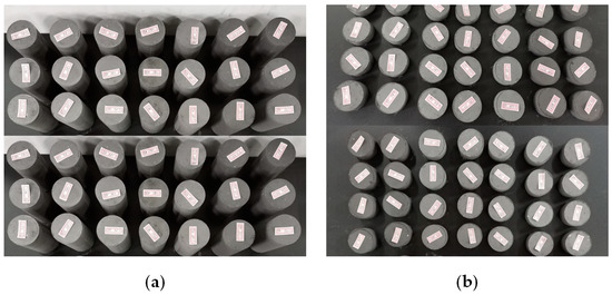 Labels were affixed to the specimens, which were then placed in a cool, ventilated area to dry for 7 days. For each set of material proportions, at least three standard cylindrical specimens and three Brazilian disc specimens were produced, resulting in a total of over 170 specimens. A portion of the completed specimens is shown in Figure 2.