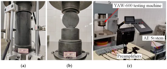 Mechanical testing of the analogous material specimens: (a) uniaxial compression test, (b) Brazilian splitting test, and (c) loading equipment and acoustic emission monitoring system.