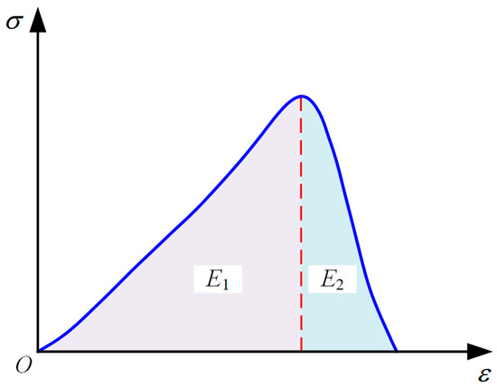 where E1 is the total input energy density calculated from the rising segment of the stress–strain curve during the uniaxial compression test and E2 is the failure energy density calculated from the descending segment of the stress–strain curve (see Figure 4). The energy density can be calculated by integrating the stress–strain curve of the specimen.