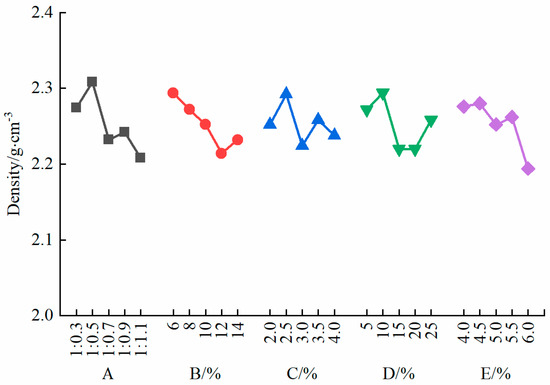 The density of the refined iron powder in the aggregates was the highest, playing a dominant role in the specimen density, while the quartz sand, being a coarse aggregate, had a negative impact on the density of the specimen. Based on the sensitivity analysis of specimen density (see Table 4), the refined iron powder–barite powder ratio had the greatest impact on the specimen density, with a range of 0.10. In contrast, the gypsum content and the rosin–alcohol solution concentration had the least effect, with a range of 0.07. The sensitivity ranking of the factors influencing specimen density is as follows: A > E > B > D = C.