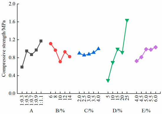 The rosin–alcohol solution primarily served as a binder within the specimen, and the binding properties of the rosin enhanced the compressive strength of the specimen. Since quartz sand is classified as a coarse aggregate with a larger mesh size, the increase in the aggregate strength positively impacted the compressive strength of the specimen. However, as the quartz sand content increased, the gaps between the aggregates within the specimen also increased, leading to a reduction in bonding strength. Consequently, the compressive strength first decreased, then increased, and then decreased again. Based on the sensitivity analysis of the compressive strength of the specimens (see Table 5), the concentration of the rosin–alcohol solution had the greatest impact on the compressive strength, with a range of 1.34. Conversely, the gypsum content had the least effect, with a range of 0.14. The sensitivity ranking of the factors influencing compressive strength is as follows: D > A > B > E > C.