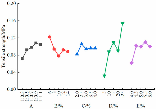 The bonding effect of the rosin–alcohol solution enhanced the tensile strength of the specimen. However, a high quartz sand content reduced the cohesion between the materials, leading to opposing trends in their impact on the tensile strength. The range analysis of tensile strength (Table 6) indicated that the rosin–alcohol solution concentration had the most significant impact on the tensile strength of the specimens, with a range of 0.12, while the gypsum content had the least effect, with a range of 0.03. The sensitivity ranking of the factors influencing tensile strength is as follows: D > E > B = A > C.