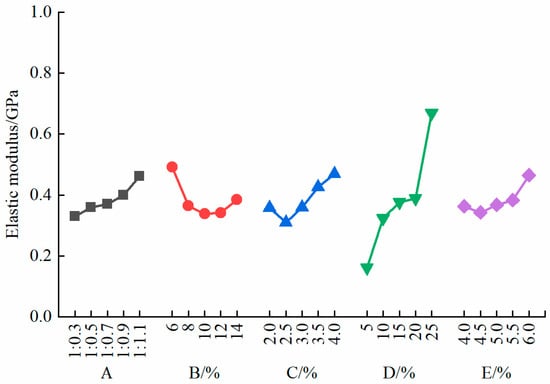 The rosin–alcohol solution primarily acted as a binder in the specimen. High concentrations of the rosin–alcohol solution contributed to the increasing the stiffness of the cementing structure. Furthermore, the relatively high elastic modulus of the rosin enhanced the overall elastic modulus of the specimen. According to the sensitivity analysis of the elastic modulus of the specimens (Table 7), the concentration of the rosin–alcohol solution had the greatest impact on the elastic modulus, with a range of 0.507. The dosage of the rosin–alcohol solution had the least impact, with a range of 0.122. The sensitivity ranking of the factors influencing the elastic modulus of the specimens is as follows: D > C > B > A > E.