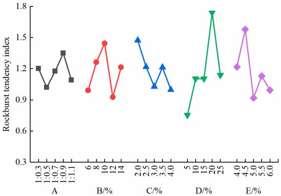 The range analysis of the rockburst tendency index (as shown in Table 8) indicated that the concentration of the rosin–alcohol solution had the most significant impact on the rockburst tendency index, with a range of 0.99. In contrast, the refined iron powder–barite powder ratio showed the least influence, with a range of 0.33. The sensitivity ranking of the factors affecting the rockburst tendency index is as follows: D > E > B > C > A.