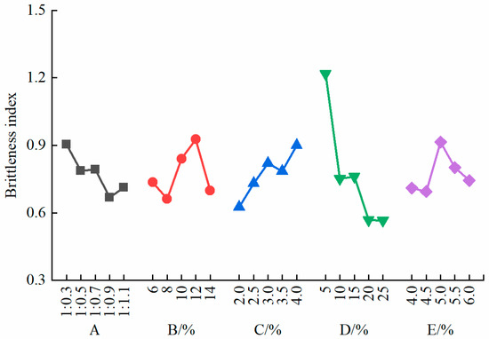 According to the sensitivity analysis of the brittleness index of the specimens (see Table 9), the concentration of the rosin–alcohol solution had the greatest influence on the brittleness index, with a range of 0.651, while the dosage of the rosin–alcohol solution had the least effect, with a range of 0.220. The sensitivity ranking of the factors influencing the brittleness index of the specimens is as follows: D > C > B > A > E.