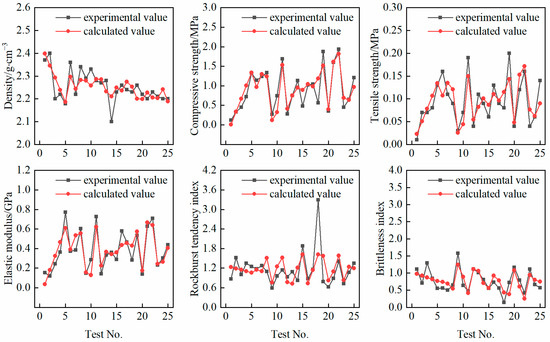 A comparison between the experimental values of each physical and mechanical parameter of the specimens and the calculated values from the multiple linear regression equations is shown in Figure 11. The multiple linear regression equations provided a good approximation of the actual physical and mechanical parameters of the specimens, demonstrating strong predictive capability for these parameters.