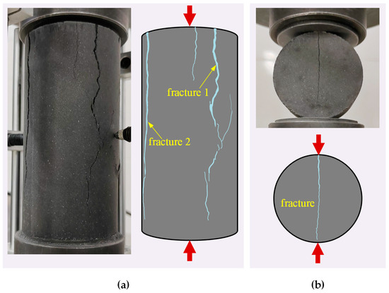 Failure mode of the analogous material specimens: (a) uniaxial compression test and (b) Brazilian splitting test.