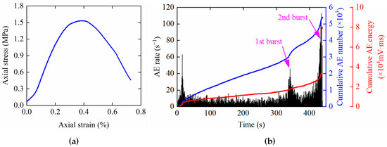 Uniaxial compression test of the analogous material specimens: (a) stress–strain curve and (b) acoustic emission characteristics.