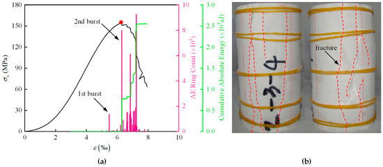 For comparison, the typical stress–strain curve, acoustic emission characteristics, and failure mode of Jinping marble under uniaxial compression [34] are shown in Figure 14. During the pre-peak stage, the Jinping marble exhibited two concentrated bursts of acoustic emission (AE) events. The first AE burst corresponded to the initiation and nucleation of microcracks within the rock, while the second AE burst corresponded to macroscopic failure, displaying a distinct exponential growth trend.