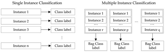 Traditional supervised learning methods rely on training sets composed of feature vectors linked to specific class labels. In contrast, multiple-instance classification (MIC) uses training sets composed of bags of feature vectors, with each bag assigned a single class label. Unlike conventional single-instance classification, MIC provides no information on the individual feature vectors’ class labels within each bag. A MIC algorithm is designed to learn from datasets structured into these labeled bags, each containing multiple instances [36]. Figure 1 illustrates the difference between single-instance and multiple-instance classification, where only the bags hold labels, with each potentially containing various instances. The number of instances within each bag may change autonomously, and a single instance can appear in multiple bags.
