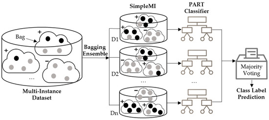 The general structure of the proposed multi-instance partial decision tree (MIPART) method is presented in Figure 2. This method applies a Bagging ensemble technique to a multi-instance dataset, where Bagging generates multiple subsets, to , by randomly sampling the dataset with replacement, creating diverse bags that reduce variance and improve generalization. In multi-instance learning, each bag is associated with a binary label—either 0 (negative) or 1 (positive)—where a bag is labeled as 1 if it comprises at least one positive instance, and 0 otherwise. Within each bag, MIPART employs the Simple Multi-Instance (SimpleMI) classifier as a base learner, constructing a partial decision tree (PART) to capture local decision boundaries. The PART algorithm adopts a separate-and-conquer strategy, incrementally generating rules without requiring global optimization. It builds a pruned decision tree for the current dataset, selects the leaf with the largest coverage, and converts it into a rule. The process is repeated recursively for the remaining instances until none are left. This simplifies the tree structure and ensures flexibility while maintaining computational efficiency [43]. Each PART tree, trained on a unique subset, produces bag-level predictions, which are then aggregated using majority voting to achieve the final class label prediction. This ensemble strategy enhances robustness and accuracy by combining perceptions from multiple independently trained bag-based classifiers.