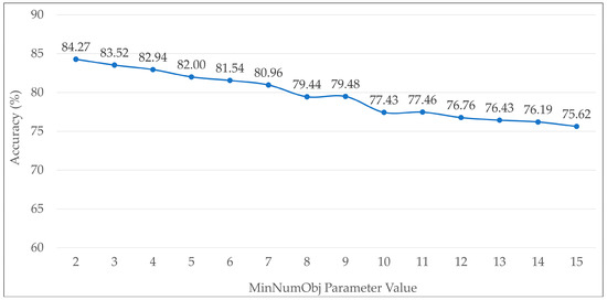 It is noteworthy to regard that, in our study, we conducted additional experiments to determine the optimal hyperparameter values for our setup. Specifically, for the BatchSize parameter, we explored values ranging from 10 to 150 in steps of 10, in addition to the default value of 100. Since the results remained consistent across all tested values, we decided to retain the default value of 100 for BatchSize in our final experiments. For the confidenceFactor parameter, which takes values between 0 and 1, we tested values of 0.50, 0.75, and 0.99, alongside the default value of 0.25. The results obtained with these different values were very similar to those achieved using the default value of 0.25. As a result, we chose to use the default value of 0.25 for confidenceFactor in our experiments. Similarly, for the minNumObj parameter, we experimented with values ranging from 2 to 15, in steps of 1, including 2 as its default value. As shown in Figure 3, the accuracy values of the model decreased as we increased the value of minNumObj, with the highest accuracy observed at the default value of 2. Based on these results, we chose to retain the default value of 2 for minNumObj.