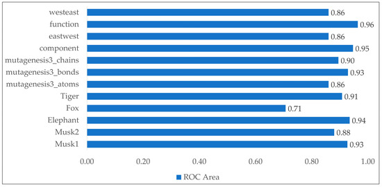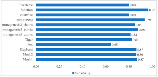Figure 4 presents the sensitivity values obtained for the MIPART method from experiments on multiple-sample learning datasets. The sensitivity metric, representing the true positive rate for each dataset, varies between 0 and 1. Results show that the highest sensitivity was achieved with the function dataset (0.97), followed by the component dataset (0.94). The sensitivity values for the Musk1, Musk2, Tiger, Elephant, mutagenesis3_atoms, mutagenesis3_bonds, mutagenesis3_chains, eastwest, and westeast datasets range between 0.80 and 0.88, while the Fox dataset has the lowest sensitivity at 0.65. The sensitivity or recall metric complements the precision–recall curve (PRC) area by directly measuring the proportion of actual positive cases correctly identified by the model. For imbalanced datasets, sensitivity ensures the model’s capability to prioritize minority class detection, which is particularly important for validating the model’s performance on such datasets. As shown in Figure 4, our method achieved an average sensitivity of 0.84, demonstrating its consistent performance in capturing minority-class instances across the datasets.