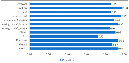 Beyond standard metrics like accuracy, sensitivity, and precision, the PRC area metric provides an additional measure of the MIPART method’s performance on twelve multi-instance datasets, as shown in Figure 5. The highest PRC area value of 0.98 was achieved with the function dataset, followed by the component dataset at 0.97. The PRC area values for the Musk1, Tiger, Elephant, mutagenesis3_bonds, and mutagenesis3_chains datasets range from 0.90 to 0.94, demonstrating the MIPART method’s effectiveness in handling multi-instance classification tasks. The PRC area values for the Musk2, mutagenesis3_atoms, eastwest, and westeast datasets also remain high, between 0.84 and 0.87, while the Fox dataset exhibited the lowest PRC area. Similar to the sensitivity metric, PRC area is especially relevant for imbalanced datasets as it focuses on the trade-off between precision and recall, emphasizing the accurate detection of minority class instances without being skewed by the majority class. Its high average value of 0.89, as illustrated in Figure 5, confirms the model’s ability to maintain a balance between these two metrics, ensuring reliable detection of minority class instances across 12 multi-label datasets. This makes the PRC area a critical metric for evaluating the performance of models, particularly in scenarios where class imbalance is a significant concern.