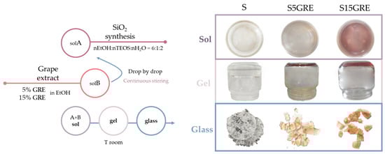 The S/GRE hybrid materials with two percentages of grape extract (GRE)—5 wt% (4.76 gGRE/100 g) and 15 wt% (95.24 gGRE/100 g)—were synthesized using the sol–gel route. As previously mentioned, GRE was incorporated into SiO2 at 5 wt% to achieve visible coloration and enable analysis of the interactions with the matrix, while 15 wt% was used to assess the effects of a higher extract load on the material properties. Briefly, tetraethyl orthosilicate (TEOS, Si(OC2H5)4, Sigma–Aldrich, St. Louis, MO, USA) (22.37 gTEOS/100 g) was added to a solution of distilled water and ethanol 99% (EtOH, Sigma–Aldrich, St. Louis, MO, USA) under magnetic stirring to form a transparent solution (Sol A), while grape extract was dissolved in EtOH to form a second solution (Sol B). Sol B was added dropwise to Sol A under continuous stirring at room temperature. The molar ratios used for the reagents were TEOS:EtOH:H2O = 1:6:2 (Figure 1). Initially, the addition of the grape extract (Sol B) to the silica solution (Sol A) resulted in a violet color, but after 3–4 days, the slightly acidic pH (5) of the silica solution caused a change in the color of the extract, which became lighter and shifted towards red (see Figure S2). After gelation, the wet gels were dried at room temperature for 24 h to obtain colored glasses. The S control was synthesized following the same protocol, without adding GRE.