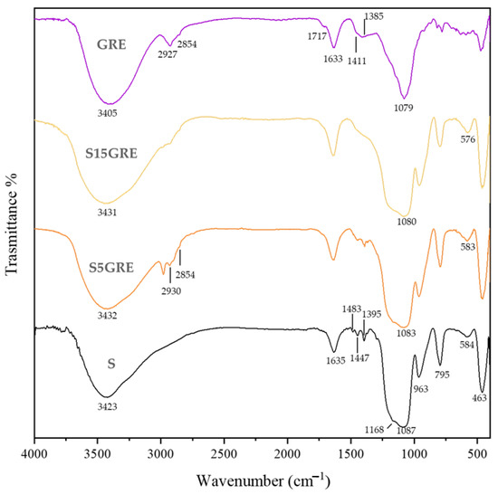 FTIR spectra of grape extract (GRE), SiO2 + 5% GRE (S5GRE), SiO2 + 15% (S15GRE), and SiO2 (S).