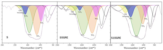 The broadened Si–O–(Si) band is the region most susceptible to variations in the spectrum, but it exhibits overlapping peaks all attributable to the asymmetric stretching of Si–O–Si. Therefore, a deconvolution and fitting on the 1500–850 cm−1 spectral range to study the different components were performed. This approach allowed for the analysis of both the blue and red shifts, as well as the changes in intensity, providing insights into how the SiO2 structure behaves in the presence of an incorporated extract. Based on previous studies [36], the Si–O–(Si) band has been decomposed into seven components, as shown in Figure 4, whereas the % of deconvoluted peak areas is shown in Figure 5. The peak assignments are summarized in Table 2. The band observed at 1300–1295 cm−1 is attributed to the C–H twisting of the residual ethanol entrapped in the S matrix. As it is possible to observe, this band area increased as a consequence of the increase in GRE percentages (Figure 5). This is because of the higher amount of organic compounds in the extract. The other bands obtained from the deconvolution were assigned to the longitudinal (LO) and transverse (TO) modes associated with the formation of four-membered (SiO4) and six-membered (SiO6) siloxane rings. These LO and TO modes play complementary roles in defining the structural and functional characteristics of silica, significantly influencing the encapsulation process of an organic dye [37]. Specifically, the bands at 1226 cm−1 and 1180 cm−1 in S have been attributed to LO6 and LO4, respectively. It is well known that, compared to TO modes, LO modes vibrate at higher frequencies, indicating greater structural stability and a denser, less porous SiO2 network (Figure 4). The intensities of the LO6 and LO4 bands increase with the rising content of GRE in the inorganic SiO2 matrix, indicating that the hybrid structure becomes denser due to the encapsulated extract stabilizing the structure through -H bonds. This suggests that less-rigid six-membered rings become more prominent as the concentration of chemical groups increases, allowing for better distribution of non-reactive organic species within the silica [38]. The bands at 1092 cm−1 and 1023 cm−1 in the silica matrix have been attributed to the TO4 and TO6 modes, which vibrate at lower frequencies compared to those for the LO modes. The presence of these bands is significant for understanding the permeability of the silica network. Both bands decrease in intensity with the addition of GRE (Figure 5), confirming a higher density structure, as the polar molecules from the extract bind to the matrix and reduce the accessibility for other analyte molecules. Concurrently, the increase in the longitudinal optical mode (LO4) and its shift towards lower wavenumbers may reflect greater structural stability or changes in the vibrational environment of the silica network, as it accommodates a higher organic content.