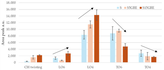 Area peak intensity of deconvoluted peaks of Si–O band in S, S5GRE, and S15GRE. The black arrows indicate the increase or decrease in the areas of the hybrid materials S5GRE and S15GRE compared tom those of S.