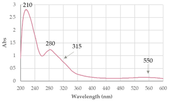 Figure 6 shows the UV–Visible spectrum of the grape extract, which was used to build a calibration curve. The GRE extract presents two bands in the UV region: one with a maximum of 210 nm and another in the range of 260–290 nm, with a maximum absorption at 280 nm. This band at 280 nm is attributed to the benzene rings present in anthocyanins due to the presence of conjugated aromatic groups. Additionally, there is a small shoulder between 310 and 340 nm, indicating the presence of an acylated sugar moiety bonded to the anthocyanin structures [39]. Finally, a weaker band is observed in the visible region, between 490 and 550 nm, with maximum absorption at 550 nm. Since the measurement is conducted at neutral pH, this absorption can be attributed to the quinoidal base form of the anthocyanins [40,41].