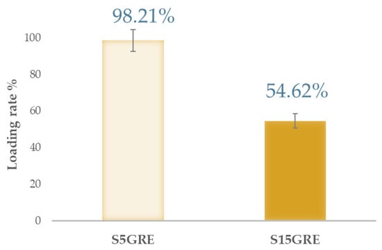 To evaluate the loading rate, the maximum absorption at 280 nm was followed. The results indicate that the percentage of grape extract (GRE) actually incorporated into the inorganic SiO2 matrix is 5% (Table 3), which is consistent with the amount initially added during the sol–gel synthesis (98.21% encapsulation efficiency, Figure 7). On the other hand, the encapsulation efficiency calculated for the S15GRE system, which was synthesized by initially adding 15% of the extract to SiO2, showed that only 8.19% (Table 3) of encapsulation efficiency (EE) was entrapped in the matrix, representing 54.62% (Figure 7) of the expected EE. Indeed, above about 8%, the mesoporous SiO2 matrix appears unable to further trap the colored extract, leading to competition among the organic molecules to establish hydrogen bonds with the SiO2.
