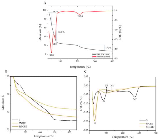 Figure 8B shows the mass loss curves for S (SiO2 without extract), S5GRE, and S15GRE, while Figure 8C presents the corresponding DTG curves from the TGA analysis. The S sample exhibits three main mass loss events. The first occurs between 30 °C and 200 °C, with two DTG minima at 44 °C and 163 °C, which are attributed to the evaporation of the residual ethanol trapped in the SiO2 matrix and the loss of absorbed water. The loss due to solvent evaporation is also observed in the curves of S5GRE and S15GRE, but with a DTG minimum shifted to 60 °C. The percentage loss increases with the amount of encapsulated extract in the SiO2, as the extract was dissolved in ethanol in proportions corresponding to the amount added during sol–gel synthesis. The mass loss observed between 200 °C and 600 °C, with a DTG peak at 547 °C in the S system, is attributed to the decomposition of the silanol groups [43]. This mass loss is absent in the hybrid materials, as the -OH groups from the silanols interact with the -OH groups released from the thermally degraded grape extract molecules, thereby enhancing stability within this temperature range. The hybrids, in addition to the mass loss associated with the evaporation of solvents, show a mass loss due to degradation after 200 °C, which is greater in S15GRE. The higher mass loss of S15GRE compared to that of S5GRE is attributed to the larger amount of extract incorporated into the silica matrix. In particular, the DTG curves for S5GRE and S15GRE display minima at 262 °C and 209 °C, respectively. These results indicate that the S matrix provides thermal stabilization to the GRE extract, with degradation observed at around 262 °C, compared to the results for the pure GRE extract, which exhibits a DTG minimum at 213 °C. This stabilization is attributed to the SiO2 network encapsulating the extract. Conversely, the S15GRE system shows a broader DTG band with a minimum of 209 °C, consistent with extract degradation. In this case, the SiO2 matrix does not fully encapsulate the extract, leaving a portion on the surface, as confirmed by the encapsulation efficiency.