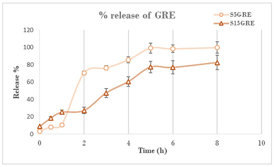 A lower GRE concentration (5%) enables all molecules to be accessible to the aqueous solvent, which, through water-molecule interactions, facilitates the release from the matrix [47]. In the third phase (5–8 h), both systems reach a plateau at which no further changes are observed, indicating an equilibrium between the samples and the aqueous medium [29].