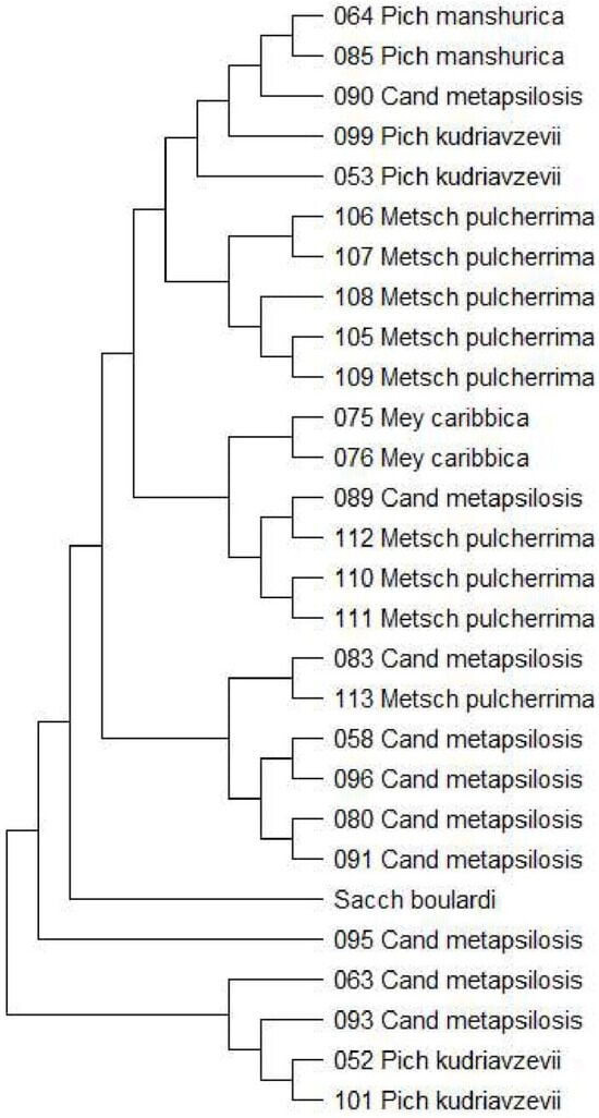 The isolation procedure for obtaining yeast from fermented products allowed us to obtain morphologically different yeasts that have been subjected to genetic identification. We identified and isolated twenty-seven strains to the species level. These strains belonged to four genera and six species, as follows: Candida metapsilosis, Candida zeylanoides, Metschnikowia pulcherrima, Meyerozyma caribbica, Pichia kudriavzevii, and Pichia manshurica. Figure 1 presents the results of the phylogenetic analysis. The isolates obtained from the WL medium grew in the form of green colonies of various morphologies, confirming that they did not belong to the Saccharomyces genus. Most of the obtained species were isolated from food of plant origin found in many parts of the world by other researchers and described in the literature as having probiotic potential based on the in vitro analyses presented below [8,10,11,13,15,16].