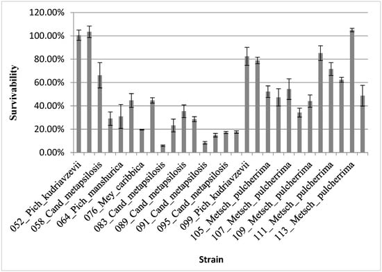 All the examined strains were subjected to in vitro digestion and presented with various survival abilities under simulated gastrointestinal (GI) conditions (Figure 2). Only 11 strains showed the same or higher survivability than the positive control (commercial probiotic Saccharomyces cerevisiae var. boulardii), with survivability at 48.70% in experimental conditions. These strains belonged to Candida metapsilosis (058_Cand_metapsilosis, 66.22%), Metschnikowia pulcherrima (105_Metsch_pulcherrima, 52.18%; 107_Metsch_pulcherrima, 54.31%; 110_Metsch_pulcherrima, 85.25%; 111_Metsch_pulcherrima, 71.55%; 112_Metsch_pulcherrima, 62.37%; and 113_Metsch_pulcherrima, 104.99%), and Pichia kudriavzevii (052_Pich_kudriavzevii, 100.61%; 053_Pich_kudriavzevii, 103.47%; 099_Pich_kudriavzevii, 82.44%; and 101_Pich_kudriavzevii, 78.94%). Similar to the findings from our last study, where yeast strains were derived from wines, some strains of Hanseniaspora uvarum, Metschnikowia pulcherrima, and Saccharomyces cerevisiae presented with above 100% survivability rates, which may suggest that GI tract conditions favour their proliferation [6]. In the cases of spoilage yeast, three out of the twenty-seven strains presented with such properties, including two Pichia kudriavzevii (052_Pich_kudriavzevii; 053_Pich_kudriavzevii) and one Metschnikowia pulcherrima (113_Metsch_pulcherrima). A similarly high ability to survive the GI tract was found for M. pulcherrima, and its probiotic potential is presented by Al-Nijir et al., 2024 [30] and Abolghasemi et al. [31]. Also, in the case of P. kudriavzevii, various authors present its promising ability to survive GI tract conditions and suggest its probiotic potential [10,11,15,19,32,33,34,35]. Aydin et al. [13] isolated six strains of P. kudriavzewi from fermented products like traditional cheese, sourdough, olive brine, and Shalgam, which showed survival rates ranging from 51% to 84.4% for the most resistant strains and yielded similar results to those presented here. In the other article, Piraine et al. [33] described the food-derived strain Pichia kluyveri LAR001 which showed probiotic potential and properties that may allow its use in further beverage production. Strains with survivability lower than the Saccharomyces cerevisiae var. boulardii CNCM I-745 were excluded from further studies.