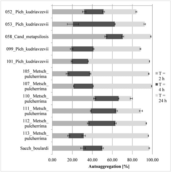 The assessment of autoaggregation ability, next to hydrophobicity, allows for the estimation of the behaviour of the studied strains in the conditions of the digestive system, and values above eighty percent are considered high [14,36]. Each of the studied strains demonstrated autoaggregation values above 80%, except for 110_Metsch_pulcherrima, which showed results at 78.96% after 24 h. However, the positive control, Sacch_boulardi, presented with very high results in the assay in all tested times (2, 4, and 24 h), with values of 30.71%, 50.02%, and 96.91%. Comparing these values to other tested strains, only three strains presented with better results than the control: 107_Metsch_pulcherrima (21.39%; 40.77%; 99.27%), 101_Pich_kudriavzevii (19.36%; 40.76%; 97.10%), and 058_Cand_metapsilosis (53.58%; 70.39%; 98.41%). The results of the assay are presented in Figure 3. The P. kudriavzewi strains isolated by Aydin et al. [13] showed a higher degree of aggregation, with most already reaching values of around 80% after 3 h, except for one strain. After 24 h, all strains aggregated in the range of 94.4–99.8%, which was similar to the reference strain of S. boulardii (98.7%). A high degree of autoaggregation was also achieved by Hsu and Chou [19] for its P. kudriavzevii isolate, with results of 76% and approximately 100% after 2 h and 24 h, respectively. On the other hand, the P. kudriavzevii IPNFG1 isolated by Lara-Higaldo et al. [15] exhibited a high autoaggregation percentage after 15 min of incubation, reaching 79.2 ± 6.6%. After 1 h, these yeasts demonstrated an autoaggregation ability exceeding 99%.