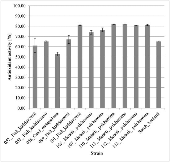 The antioxidant activity assay showed that all the tested strains had high antioxidant abilities. In comparison to the control sample of Sacch_boulardi (65.10%), eight strains presented with a higher antioxidant activity. The strains included two P. kudriavzevii (099_Pich_kudriavzevii, 67.05% and 101_Pich_kudriavzevii, 81.36%) and six M. pulcherrima (105_Metsch_pulcherrima, 74.01%; 107_Metsch_pulcherrima, 76.47%; 110_Metsch_pulcherrima, 81.90%; 111_Metsch_pulcherrima, 82.05%; 112_Metsch_pulcherrima, 80.92%; and 113_Metsch_pulcherrima, 81.23%). The results of the assay are presented in Figure 5. Our results are similar to the results obtained by Staniszewski and Kordowska-Wiater [6]. Hsu and Chou [19] obtained high results (above 50%) only for 31.6% of their isolated yeast strains but not for P. kudriavzevii, which showed about 35% antioxidant activity. Agarbati et al. [7] reported antioxidant activity for M. pulcherrima strains in the range of 11.65–60.12% and for S. cerevisiae between 46.12 and 66.49%, with the reference CODEX strain showing 65.58%. This was below the results obtained by our strains. Wang et al. [10] obtained very good results from yeast isolates in reaction with DPPH, which exceeded 80%, and in P. kudriavzevii and S. cerevisiae which exceeded 90%. In the study by Fernandez-Pacheco et al. [44], the highest percentage in the reduction of DPPH was for two Saccharomyces strains (3 and 6) and one P. kudriavzevii (1200) with values of 33.71%, 32.66%, and 33.42%, respectively, which was 2–2.5 times less than in this analysis report.