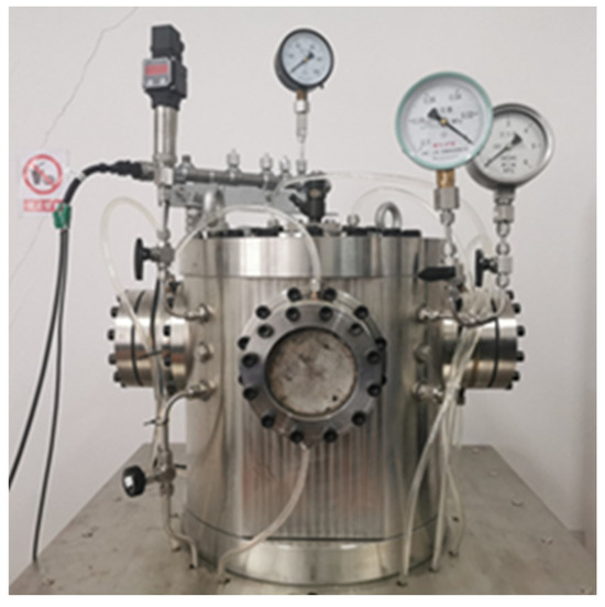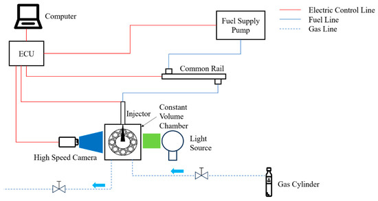 The experimental setup is shown in Figure 1, and the Constant Volume Chamber (CVC) is shown in Figure 2. A high-speed camera was used to capture the spray pattern. The exposure time of the camera is 40 μs. The injector used in the experiment was a circular nozzle with an orifice diameter of 0.3 mm and an orifice length of 1 mm. The fuel injection pressure was 120 Mpa. Nitrogen was used as the ambient gas, with an ambient temperature of 308 K, an ambient pressure of 6 Mpa, and an ambient density of up to 65.6 kg/m3. The initial stage of the experiment involved the evacuation of the vacuum and the introduction of the supply gas into the CVC. The subsequent step was to heat the gas until the internal pressure of the CVC reached the designated experimental conditions. The third stage comprised the oil spraying operation, conducted in conjunction with the optical experiments, and concluded with the final venting operation, which was undertaken after the spray image had been captured. The liquid fuel used in the experiment was diesel fuel, and the physical parameters of the fuel are shown in Table 1.