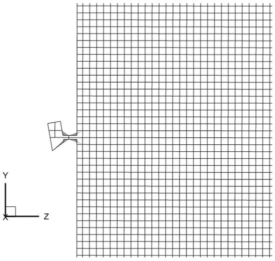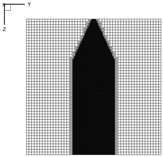 The injector used in the simulation calculation process of this paper was a six-hole nozzle with a hole diameter of 0.3 mm and a hole length of 1 mm, and the geometric model is shown in Figure 3. To simplify the calculation, the 1/6 model was used in the VOF calculation, and the specific structural parameters of the nozzle holes are shown in Table 2. A 4 mm base grid size was used for VOF calculations, with a 3-level scale at the nozzle, and an adaptive mesh refinement (AMR) depending on the velocity gradient and the temperature gradient. The turbulence model adopted was the LES model, and the mesh is shown in Figure 4, with the XZ plane as the long-axis plane of the elliptic orifice, and the YZ plane as the short-axis plane of the elliptic orifice.