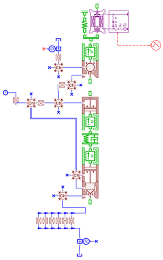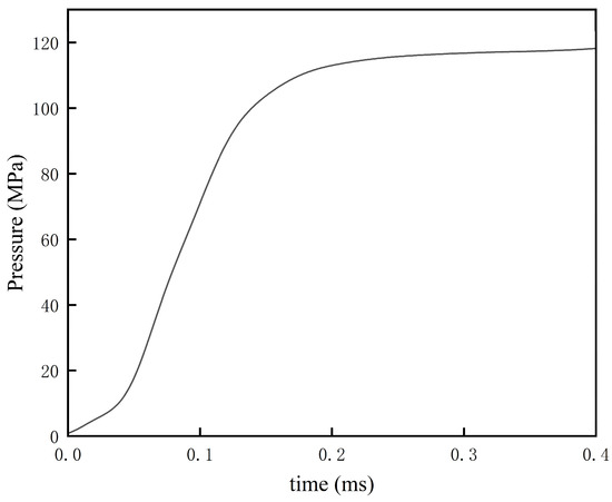 In order to more closely approximate the actual operating conditions of the diesel engine, the boundary conditions for the injector inlet pressure were derived from the one-dimensional simulation model in AMESIM. Figure 5 shows the model, and Figure 6 shows the resulting pressure versus time curve.