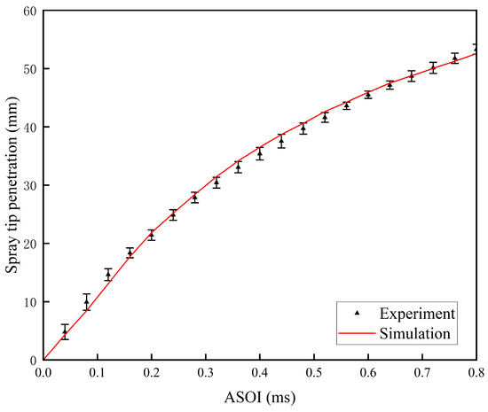 To verify the reasonableness of the model selection, the simulation value of the STP was compared with the experimental value, and the experimental value of spray tip penetration was obtained from the ensemble average of 6 tests. The results are shown in Figure 9. The average error between the simulation value and the experimental value was 4.24%, which was less than 5%, and it could be concluded that the model selection was reasonable. Simulation calculation working conditions are shown in Table 4.