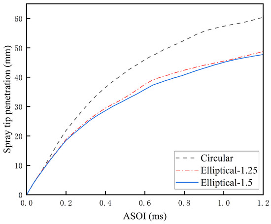 (1) Compared with the circular nozzle, the STP of the elliptical nozzles decreased dramatically, and the STP of elliptical nozzles with aspect ratios of 1.25 and 1.5 decreased by 19.29% and 20.96%, respectively, and STP for the elliptical nozzle with larger aspect ratio was observed to be smaller. The reasons for this were the fact that the elliptical nozzles had a larger spray surface area, which was subjected to greater aerodynamic drag, and that the elliptical nozzles were more likely to generate stronger turbulence, resulting in faster kinetic energy dissipation.