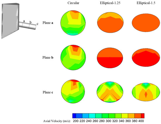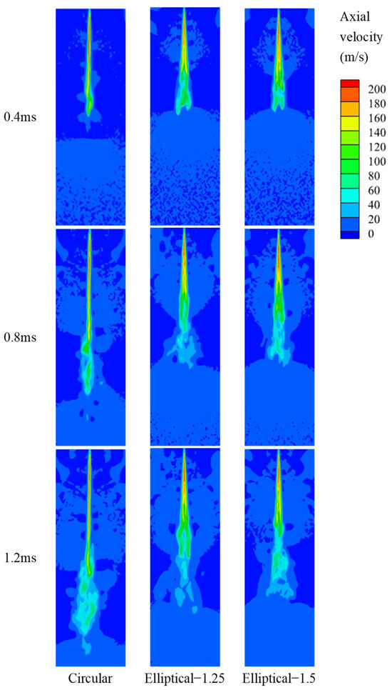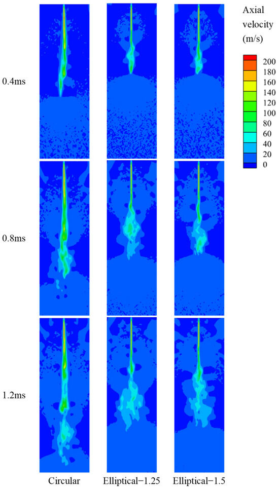Figure 10 shows the comparison of STP between circular and elliptical nozzles. According to Figure 10, it can be seen that the STP of elliptical nozzles was substantially reduced compared to that of the circular nozzle, and the difference between elliptical spray nozzles with different aspect ratios was not significant. In the initial phase of the spraying process, the gap in STP was small, and then the gap gradually increased. After the start of injection (ASOI) of 1.2 ms, the STP of elliptical nozzles with aspect ratios of 1.25 and 1.5 decreased by 19.29% and 20.96%, respectively, compared with that of the circular nozzle, and the elliptical nozzle with larger aspect ratio had the smallest STP. Figure 11 and Figure 12 show the axial velocity distributions of circular and elliptical spray nozzles in the XZ plane and YZ plane. The axial velocity of the red part exceeded 200 m/s. It is obvious from the figure that the red part of the circular nozzle was longer than that of the elliptical nozzle, indicating that the spray velocity of the circular nozzle decreased more slowly and was subjected to less aerodynamic drag. The difference in the spray penetration distance of elliptical orifices with aspect ratios of 1.25 and 1.5 was not significant, probably due to the fact that after the spray was ejected from the orifices, they had an elliptical cross-section, and the spray from elliptical orifices tended to make the cross-section more rounded during axial development, resulting in faster diffusion of the spray in the radial direction, which inhibited the axial development of the spray. It also had a correlation with high environmental density. Yu et al. mentioned that the high backpressure can inhibit the instability fluctuation and deformation of the spray [22]; at a high ambient density of 65.6 kg/m3, the spray was more affected by ambient gases, which suppressed the differences between them. Three cross-sections were taken at 0.8 mm, 0.4 mm from the nozzle outlet and at the nozzle outlet. At ASOI of 0.4 ms, the velocity distributions on the three cross-sections are shown in Figure 13. From Figure 13, it can be seen that there was no significant decrease in the velocity of the circular nozzle, while the decrease in the velocity of the elliptical nozzle was more pronounced. Under the condition of the same cross-sectional area and the length of the nozzle, the inner wall surface area of the elliptical orifice nozzle was larger than that of the circular orifice nozzle, and the diesel fuel lost more kinetic energy in the inside of the nozzle, resulting in a reduction in the Initial kinetic energy of the spray. The axial velocity of the elliptical nozzle decreased more rapidly at the centerline of the spray than at the outside of the spray, causing the spray to move radially in the direction of aerodynamic drag, drawing in more gas from the outside of the spray and consuming the kinetic energy of the spray, Increasing the area of contact with the gas, and also being subjected to greater aerodynamic drag, resulting in smaller STP. The axial velocity fields of circular spray were similar in both planes, while the axial velocity fields of elliptical spray differed greatly in both planes, mainly because the curvature of the major axis of elliptical nozzles was smaller, and the spray was subjected to a larger shear force in the direction of the major axis. Due to the uneven distribution of the shear force in the direction of the major and minor axes of the elliptical nozzles, the flow velocity of elliptical spray was different in the direction of the major and minor axes, and thus, it was easier to generate stronger turbulence. The enhanced turbulence led to faster kinetic energy dissipation of the spray, thus reducing the STP.