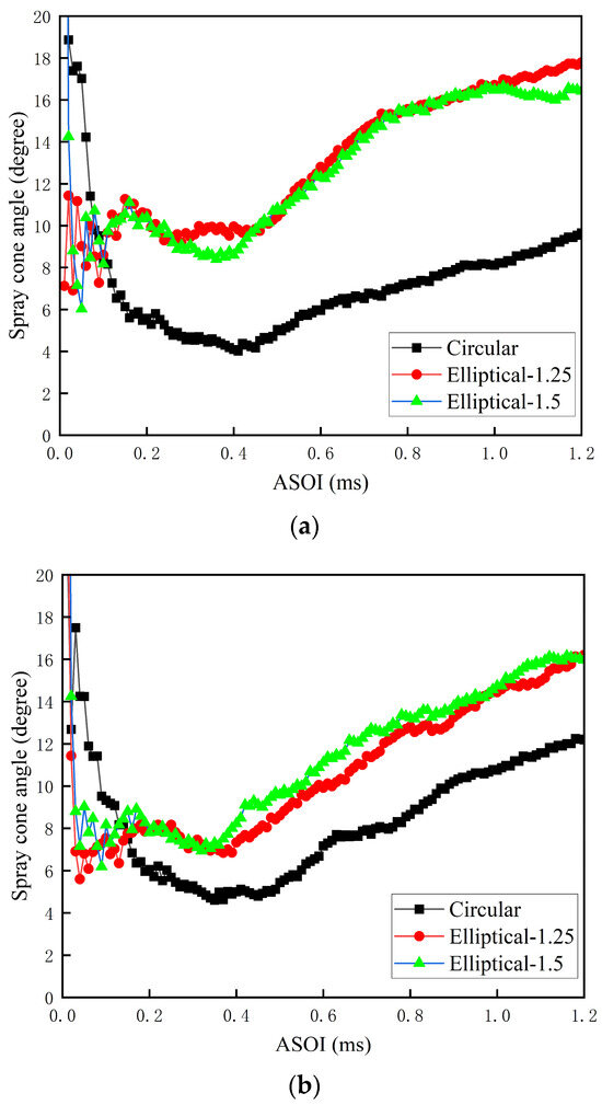 (2) In the XZ plane, the average SCA of elliptical nozzles with aspect ratios of 1.25 and 1.5 increased by 76.90% and 77.17%, respectively, compared to that of the circular nozzle, and in the YZ plane, the average SCA of elliptical nozzles with aspect ratios of 1.25 and 1.5 increased by 27.04% and 37.43%, and the average SCA of the elliptical nozzle with a larger aspect ratio was the largest in both planes. The reason was that the initial cross-section of the spray with elliptical nozzles was asymmetric, the asymmetry of the spray resulted in the instability of the spray boundary layer, and the surrounding gas volume suction effect was stronger, so the contact area of the elliptical spray and ambient gas was larger than the circular one, and the elliptical spray was subjected to greater aerodynamic drag during spraying, resulting in reduced STP and SCA becoming larger.