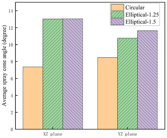 Figure 14 shows the SCA of the circular and elliptical nozzles in two planes, the XZ plane and the YZ plane, while Figure 15 shows the average SCA of the circular and elliptical nozzles in two planes, the XZ plane and the YZ plane. At the initial stage of spraying, diesel fuel was just sprayed from the orifice, and the SCA fluctuated widely, gradually reducing to a relatively stable value. With the injection process, the fuel beam gradually began to diffuse radially, so the SCA gradually increased. After the SCA became relatively stable, the SCA of the elliptical nozzle was larger in both planes, compared with the circular nozzle. In the XZ plane, the average SCA of elliptical nozzles with aspect ratios of 1.25 and 1.5 increased by 76.90% and 77.17%, respectively, compared to that of the circular nozzle, and in the YZ plane, the average SCA of elliptical nozzles with aspect ratios of 1.25 and 1.5 increased by 27.04% and 37.43%. The reason may be that the initial cross-section of the spray with elliptical nozzles is asymmetric; to balance the surface tension in different directions, the spray will tend to make the cross-section more rounded during the axial development. The asymmetry of the spray results in the instability of the spray boundary layer, which causes the spray to break up and atomize earlier, resulting in the spray spreading faster in the radial direction. This also results in the contact area between the spray of the elliptical nozzles and the ambient gas being larger than that of the circular nozzle, resulting in the spray of the elliptical nozzles being subjected to greater aerodynamic drag in the spraying process. As a consequence, the STP is reduced, and the SCA becomes larger, which is conducive to the atomization of the spray.