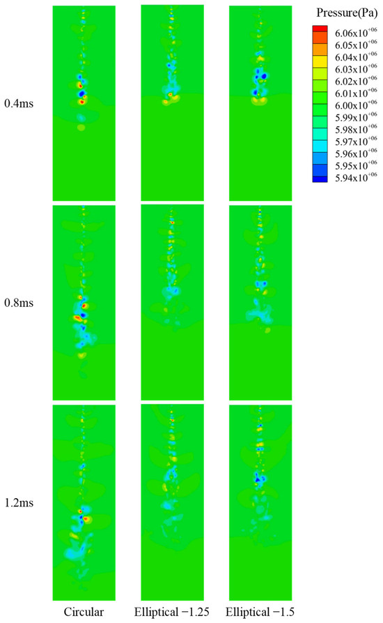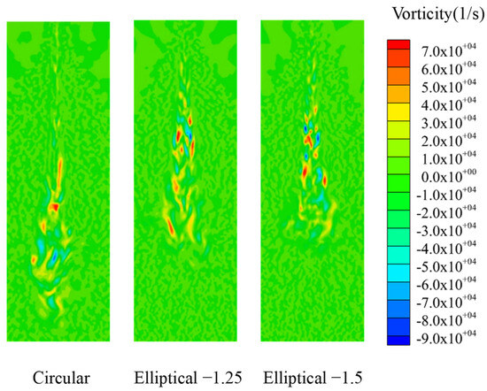 Figure 16 shows the pressure distributions of circular and elliptical nozzles in the XZ plane. The low-pressure part was mainly distributed in the spray head and was interspersed with the high-pressure part. Compared with the circular nozzle, elliptical nozzles had more low-pressure parts during spraying, a larger area, and a wider distribution area, and the pressure difference moved the gas into the spray and mixed it with the diesel fuel, which resulted in the sprays of elliptical nozzles winding the gas from the outer part of the spray earlier, giving a better radial development. The high-pressure part of the elliptical nozzle spray was concentrated at the tip of the spray, which inhibited the axial development of the spray. Figure 17 shows the vorticity distributions of circular and elliptical spray nozzles in the XZ plane at ASOI of 1.2 ms. As seen from the figure, the vorticity of the elliptical spray was larger than that of the circular nozzle, while the vorticity field of the circular spray was more uniformly distributed compared to the elliptical nozzles. This indicated that the elliptical spray was subjected to stronger turbulence perturbation than the circular nozzle, which enhanced the interaction between the spray and the ambient gas.