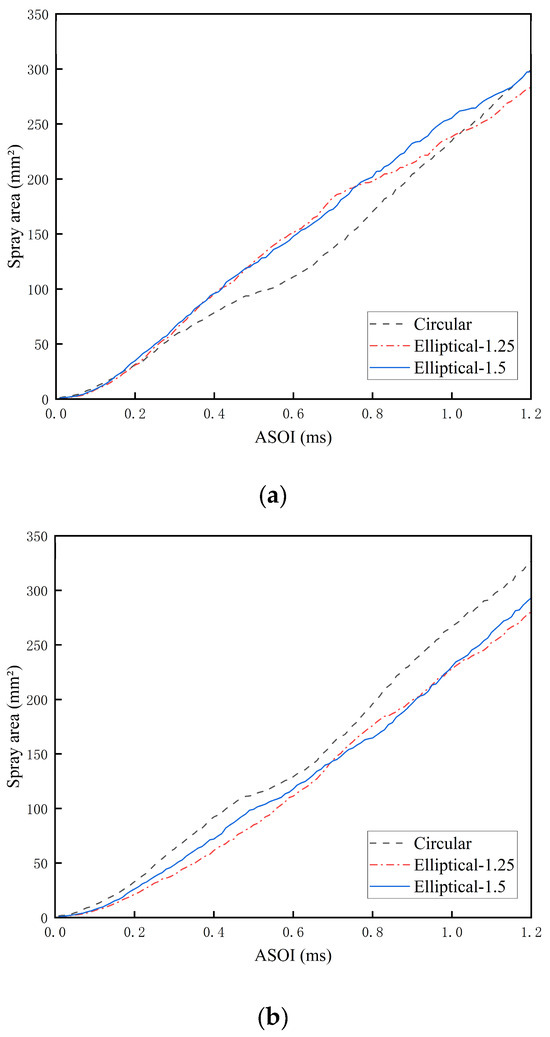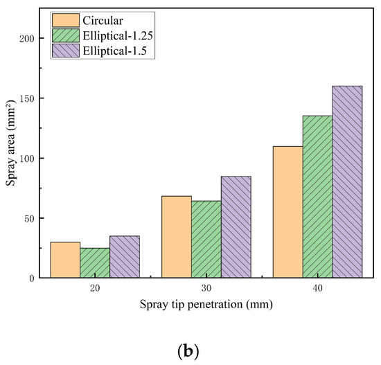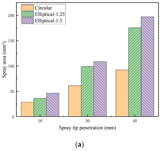 (3) In the XZ plane, the SA of elliptical nozzles was larger, and the average SA of elliptical nozzles with aspect ratios of 1.25 and 1.5 increased by 9.39% and 13.05%, respectively, compared to that of the circular nozzle. Additionally, after the spraying process, an elliptical nozzle with a larger aspect ratio exhibited the largest SA. In the YZ plane, the average SA of elliptical nozzles with aspect ratios of 1.25 and 1.5 decreased by 17.28% and 14.38%, respectively, compared to that of the circular nozzle. For the same STP, the elliptical nozzle with a larger aspect ratio exhibited the largest SA in both planes.